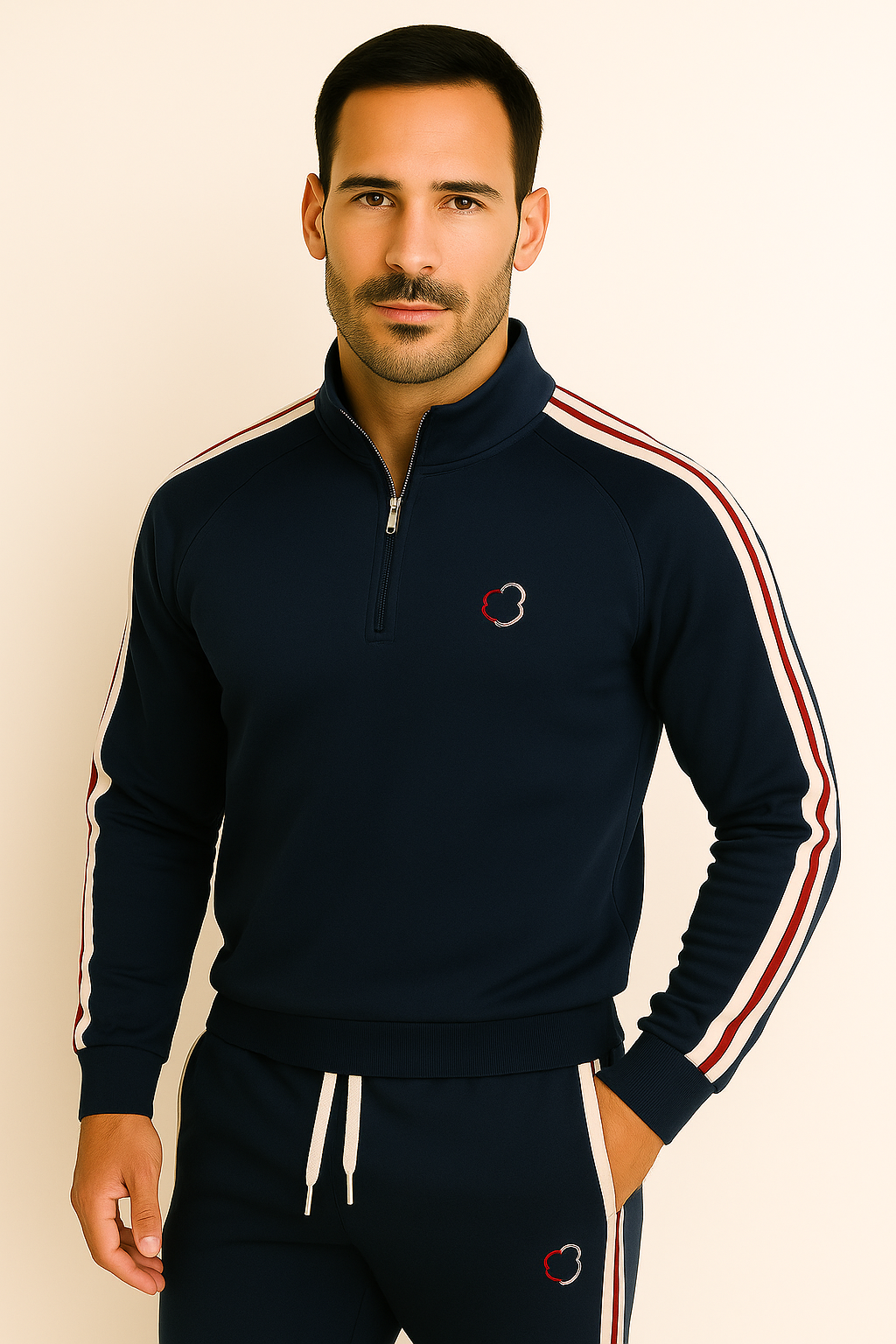 Denne treningsdressen er designet for menn som søker den rette balansen mellom sporty energi og raffinert komfort, og tilbyr en uanstrengt stil som er perfekt for trening, reiser eller avslapning.